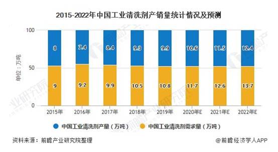 2019年,我國工業(yè)清洗劑產(chǎn)量在9.9萬噸左右,需求量為10.8萬噸,預(yù)計(jì)到2022年,我國工業(yè)清洗劑產(chǎn)量將增長至12.4萬噸。2018年我國工業(yè)清洗劑市場規(guī)模為38.0億元,2019年我國工業(yè)清洗劑市場規(guī)模增長至39.4億元。隨著中國制造產(chǎn)業(yè)升級的逐步實(shí)施以及中國本土企業(yè)在中高端制造業(yè)不斷取得突破,中國工業(yè)清洗劑市場還將取得穩(wěn)步發(fā)展。